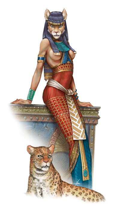 Bastet, chiamata anche Bast o Oubastet, è una dea dal duplice aspetto, pacifico e terribile: nella sua forma di gatta è la dea benevola, protettrice, dea della gioia e delle partorienti; nel suo aspetto feroce è nota per le sue collere, rappresentata con testa leonina, e chiamata Sekhmet, la Possente, dea della guerra. Come tutti i felini è attraente e pericolosa assieme, dolce e crudele: è il simbolo della sensualità, la protettrice del focolare e della maternità, ma è anche pronta ad abbandonare Merratet, il suo reame ysgardiano per lottare quotidianamente con il serpente Apophis, colui che contrasta la corsa della barca solare di Ra e delle forze benigne della creazione. Si dice che questo potere sia la guardiana di ogni gatto esistente, nessuno dei quali può ferirla. Tuttavia, è amaramente osteggiata dal signore dei gatti delle Terre Bestiali, che la vede come un'usurpatrice ed una illegittima padrona dei cuori dei gatti di ogni dove. Si dice che i sogni di Bast echeggino nel suo reame, immagini di caccia e di feste sanguinose, ma coloro che apprezzano i sogni si suppone siano al sicuro dai felini notturni.