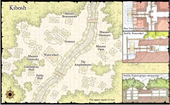 Kibosh è una città gnosmesca di modeste dimensioni, abitata all'incirca da quattrocento gnomi. È situata in un'ampia regione collinare, a est di una grande foresta incontaminata. Una strada che si snoda verso sud per qualche chilometro è la via d'accesso per il commercio, e gli gnomi danno il benvenuto ai forestieri che si presentano al mercato settimanale che si tiene vicino al fiume. [1]